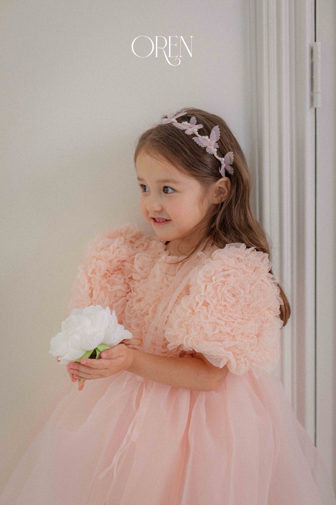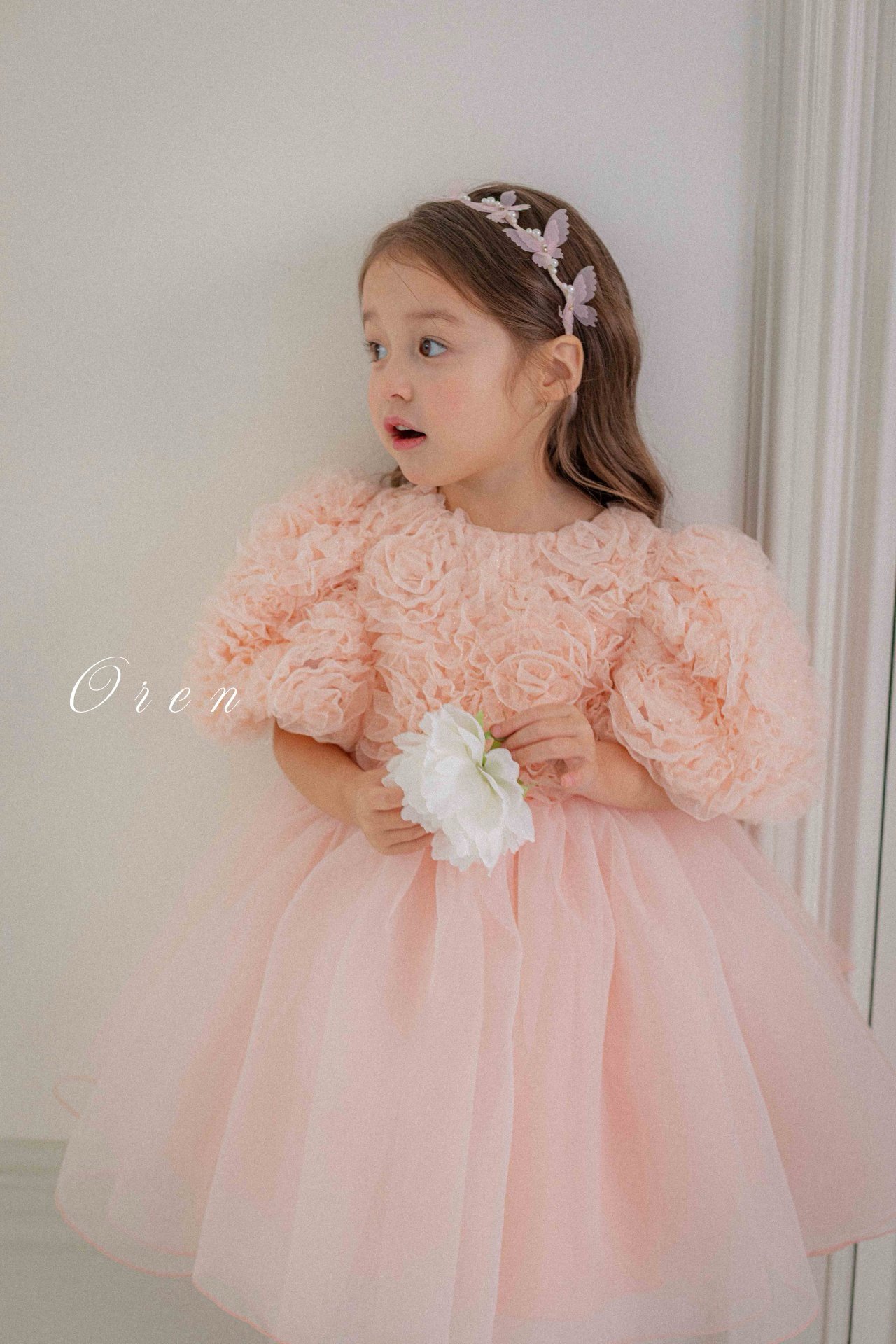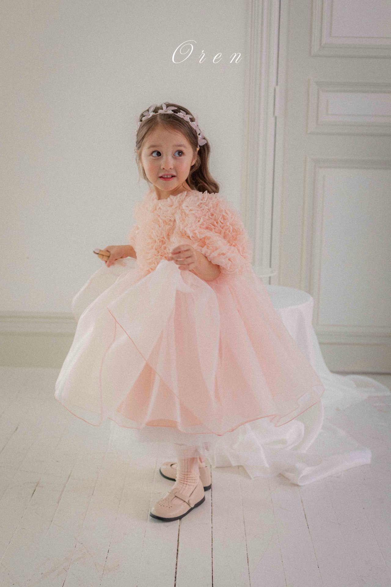 فستان بناتي بطبقه تور ناعمه و الدانتيل الراقي – اللون بيج