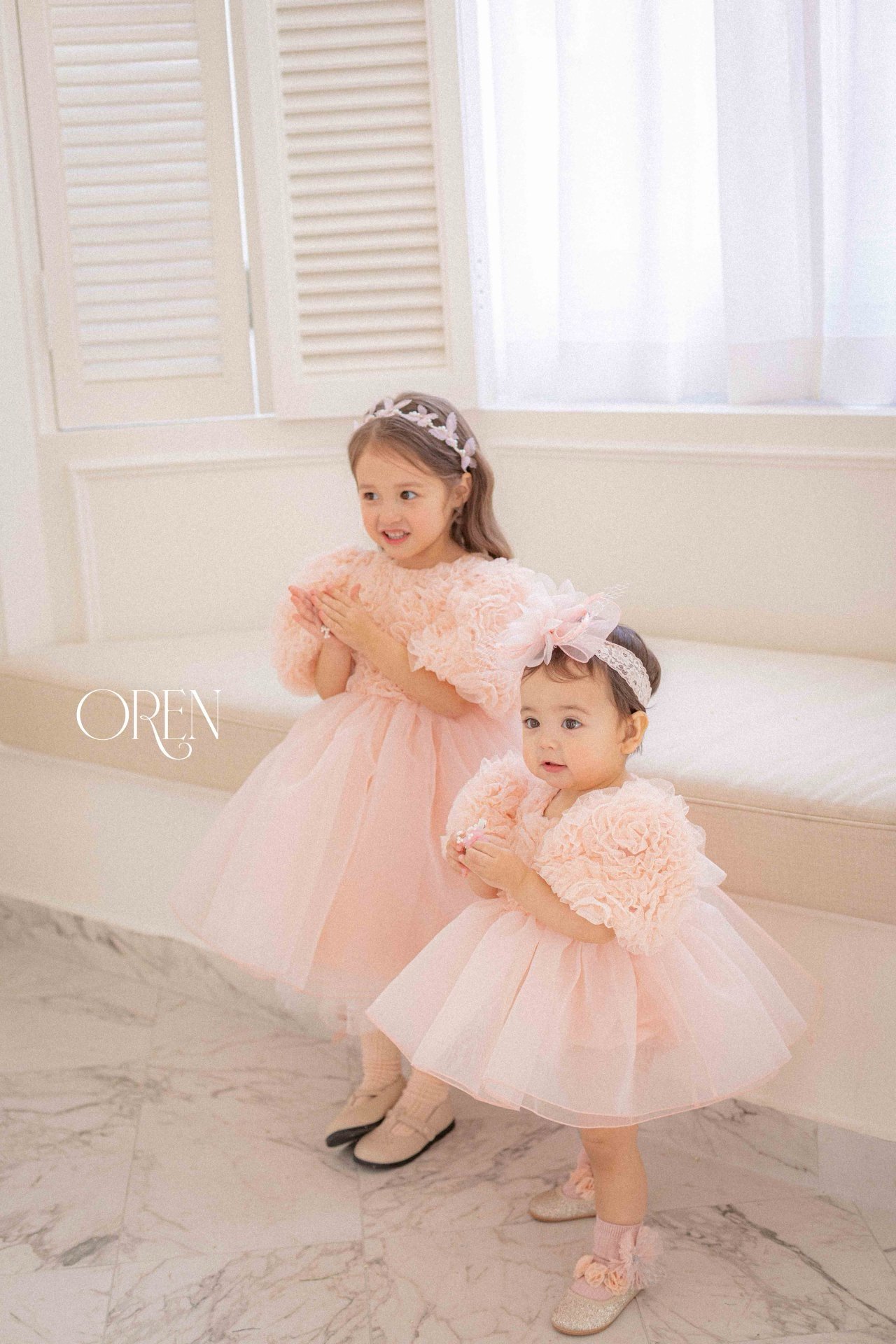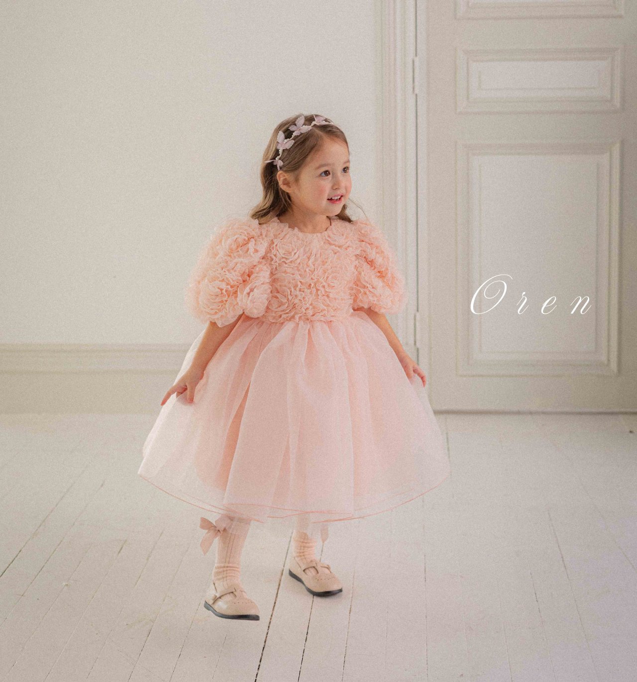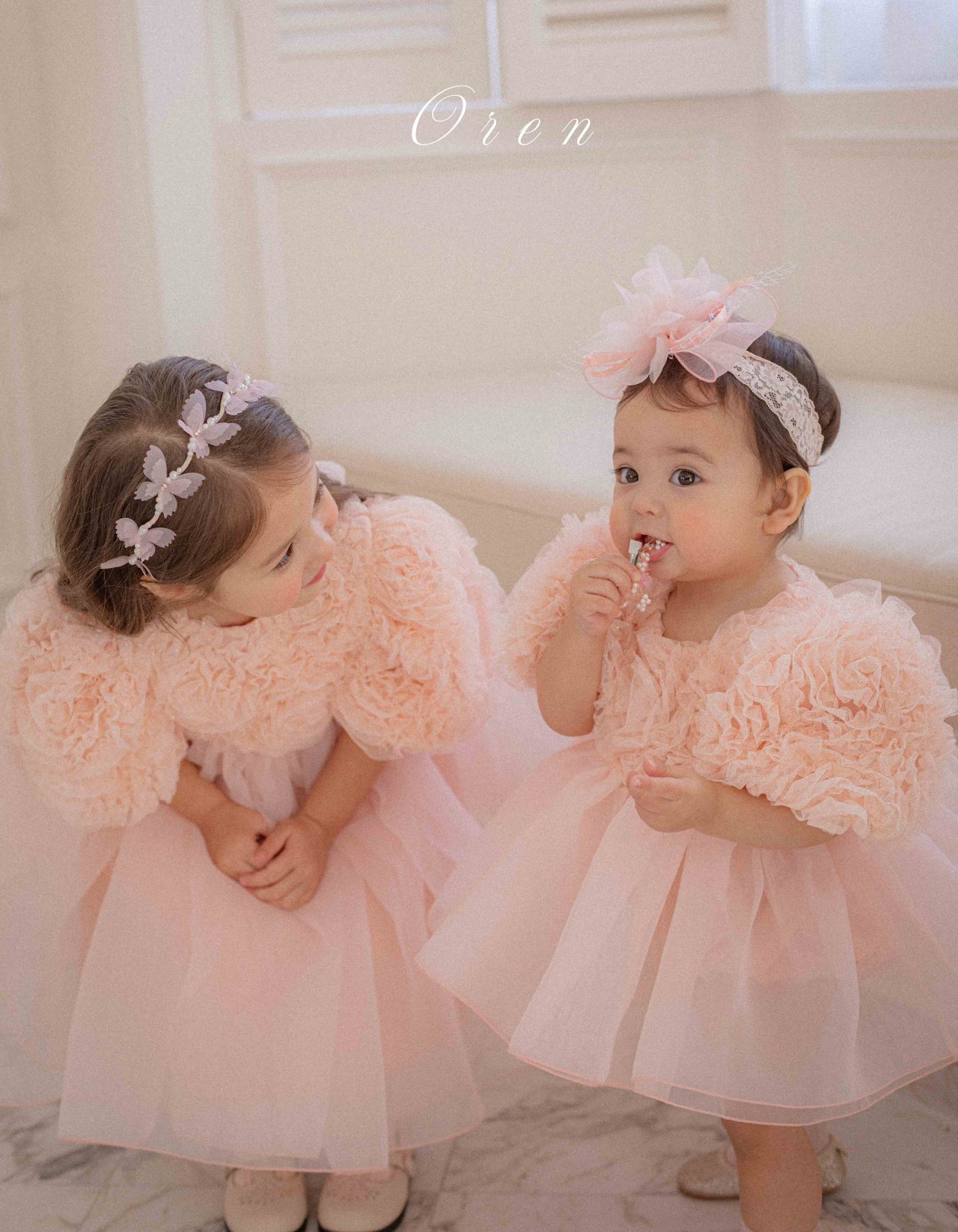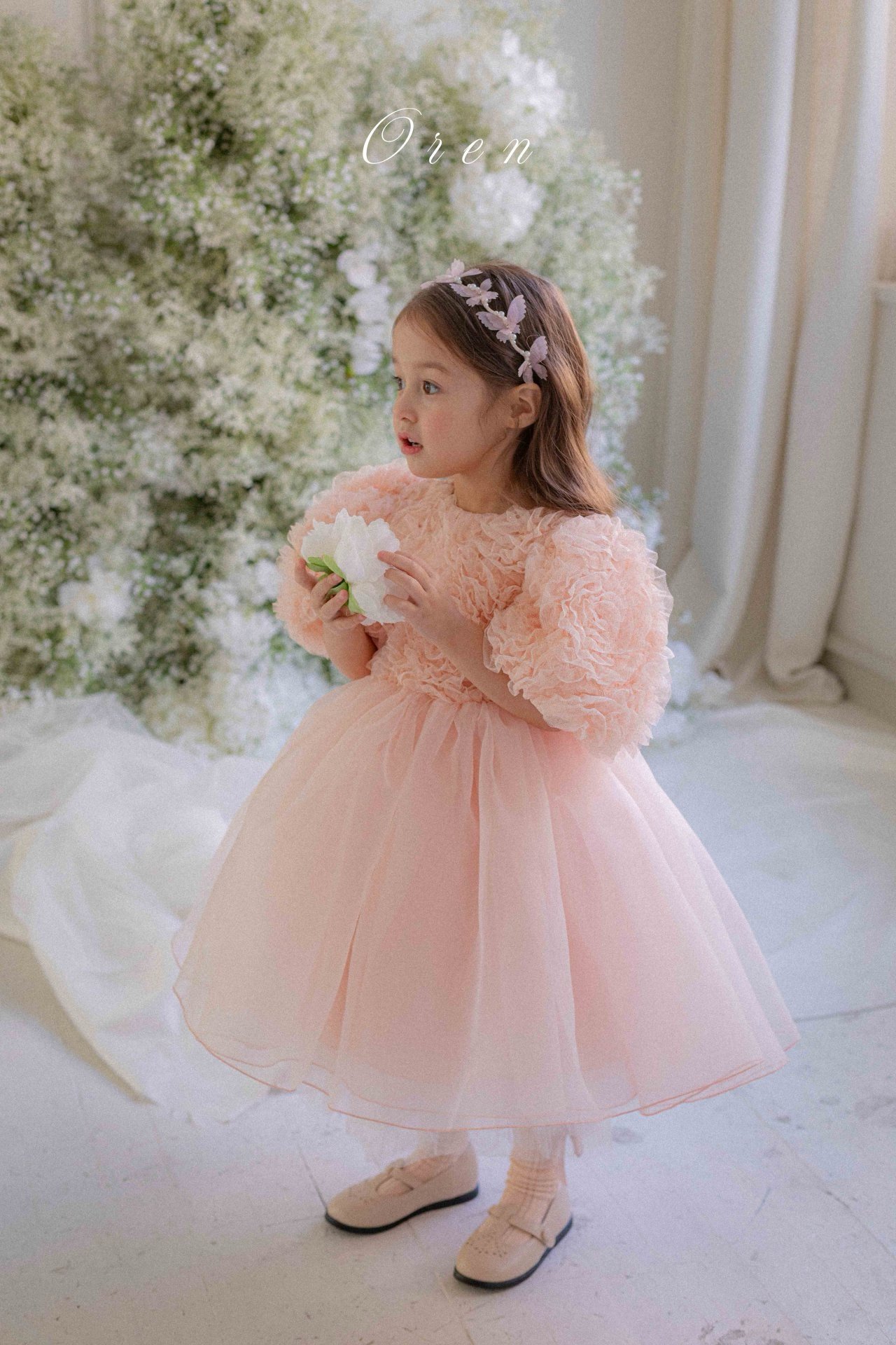 فستان بناتي بطبقه تور ناعمه و الدانتيل الراقي – اللون بيج