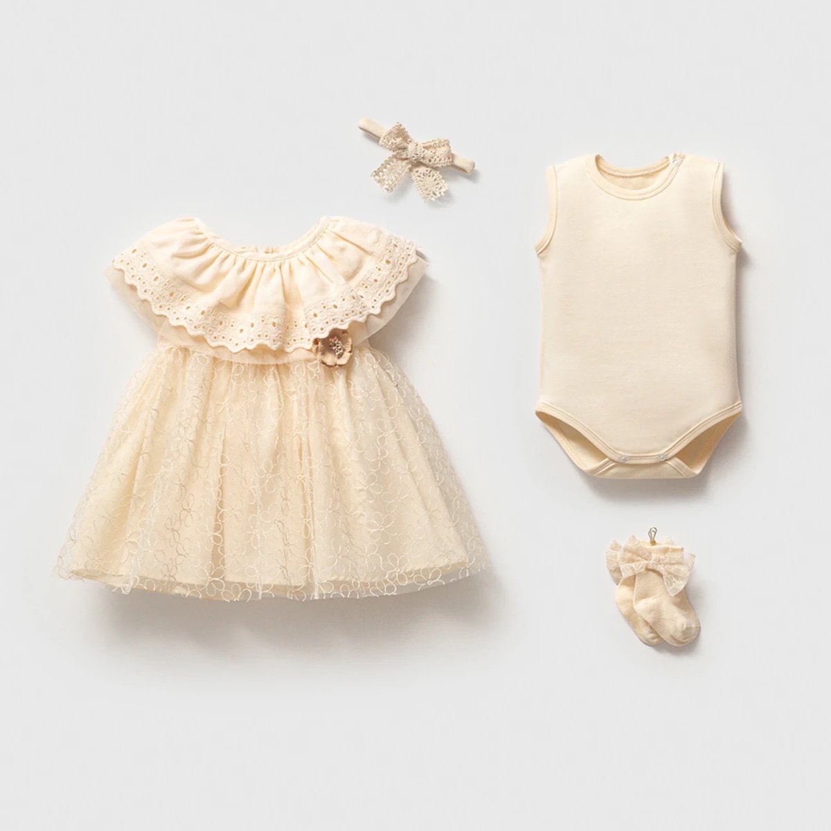 فستان بناتي بطبقه تور ناعمه و الدانتيل الراقي مع كاب بونية